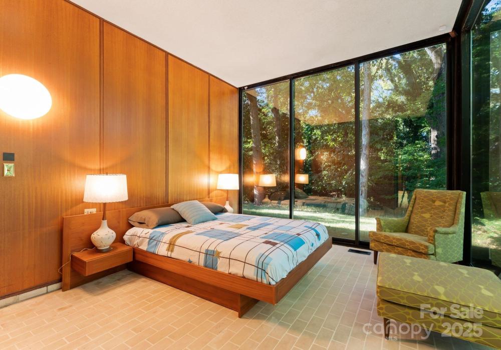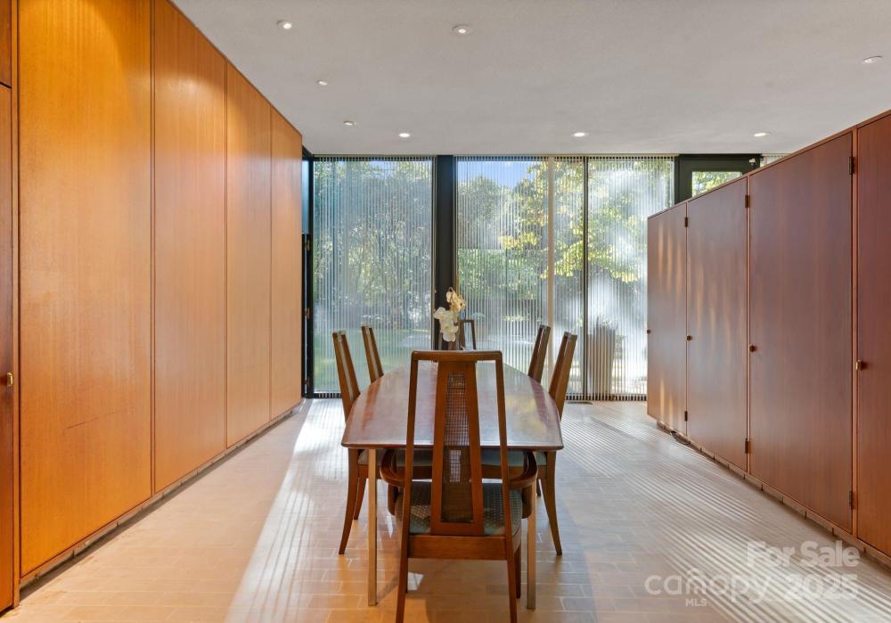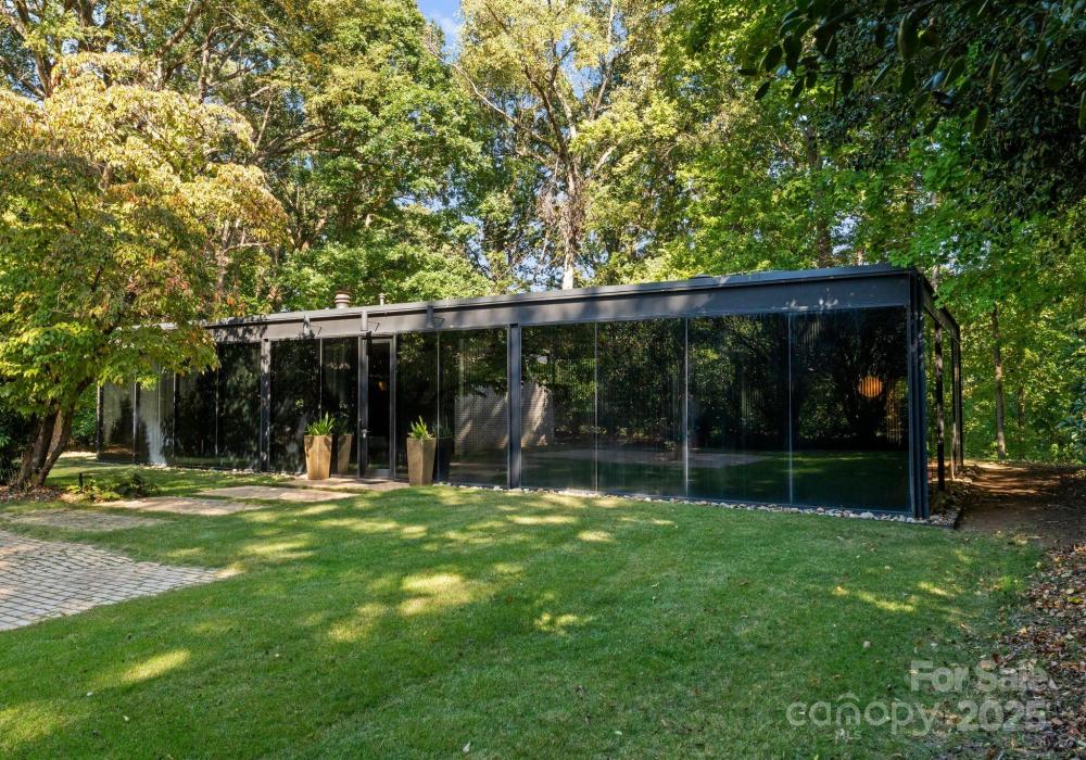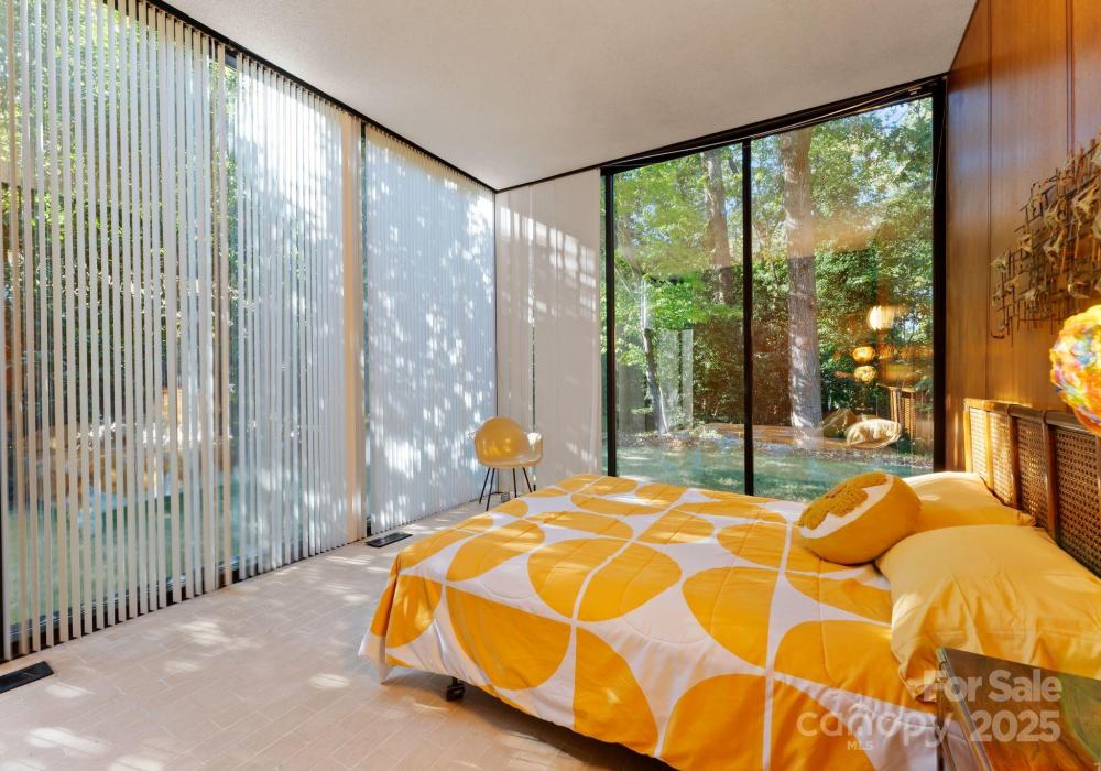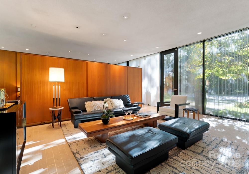 The Bates Glass House, circa 1960, was designed by prominent Charlotte architect Charles Bates as his family home, drawing inspiration from Philip Johnson's iconic New Canaan, Connecticut Glass House built a decade prior. The avant-garde nature of steel and glass pavilion homes from the mid-century era contribute to their rarity both locally and nationally. As much a work of art as it is a residence, The Bates Glass House is one of few Charlotte residences which can claim elite Trophy Property status. Nestled on a serene wooded lot overlooking a pond in what was once rural Charlotte, the residence today is centrally located in our expanding city, yet still retains its original sense of seclusion. The interior teak wall panels and built-ins combined with terrazzo brick flooring create a warm and balanced aesthetic juxtaposed to the glass and steel facade. Seamless integration with the natural surroundings extends a soothing connection to the natural world. The Bates Glass House is truly exceptional in every way. Stay tuned for additional photos to be released throughout the week leading up to Active status on Friday October 17th. This home is expertly staged by Charlotte Vintage with over 50 pieces of period authentic vintage furnishings and decor, all of which are for sale.
