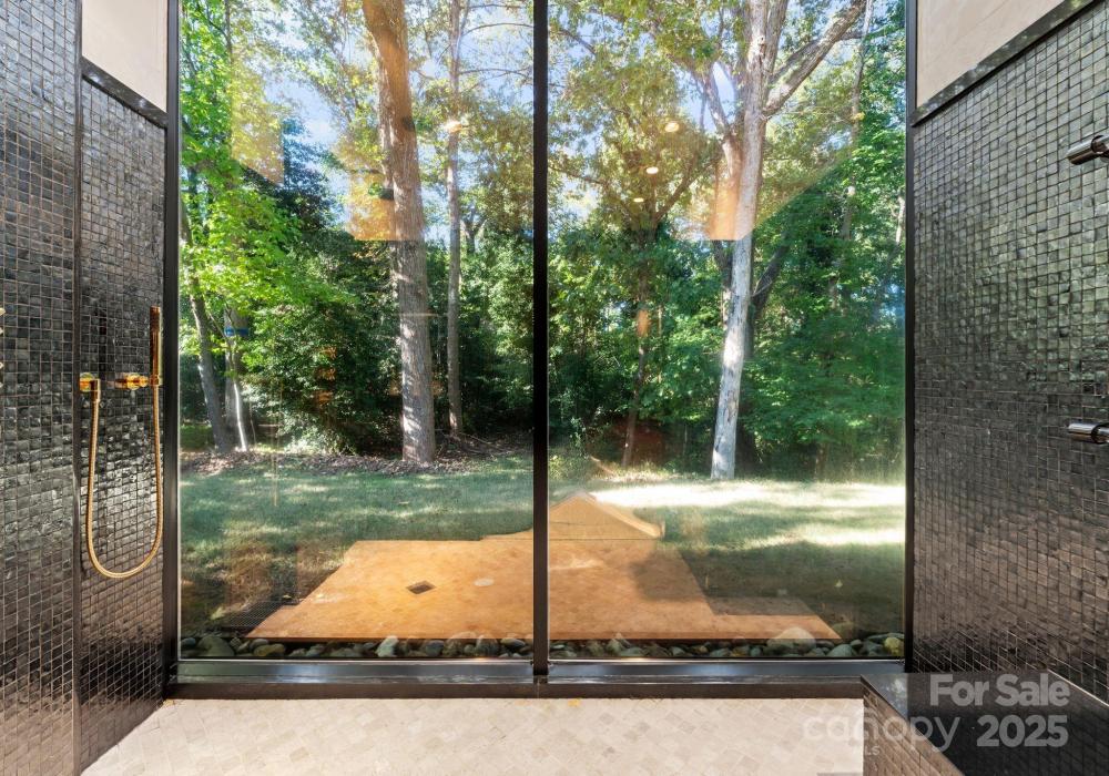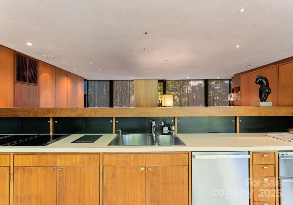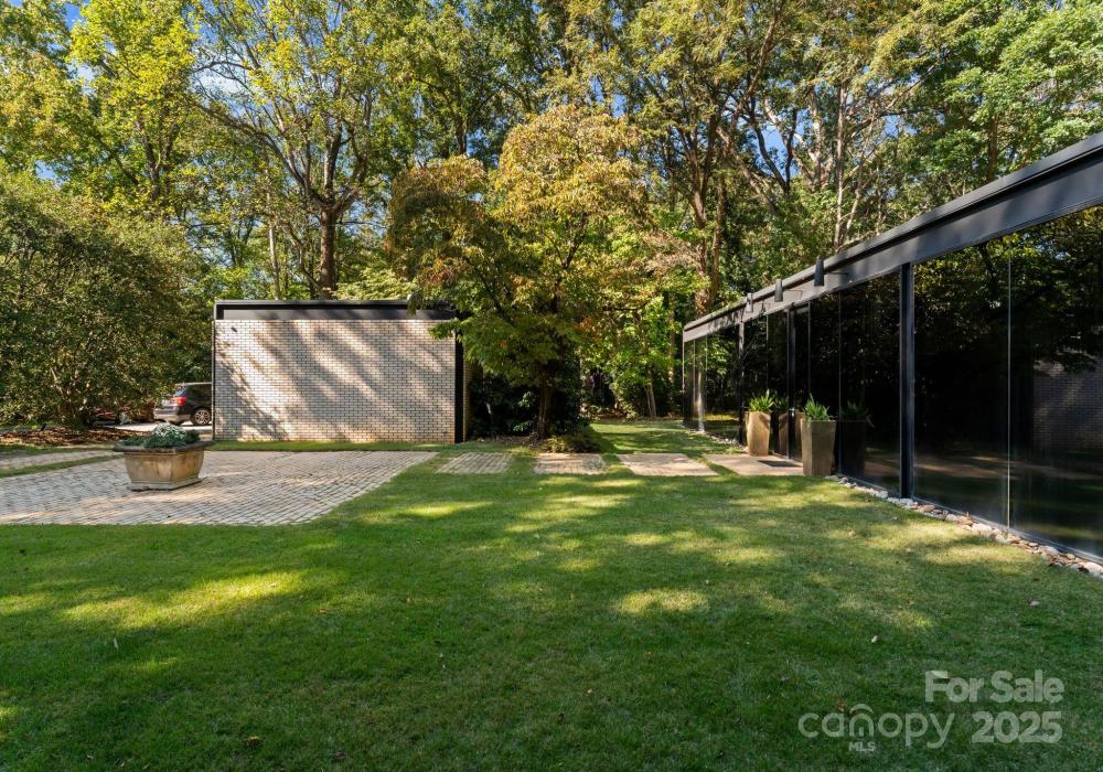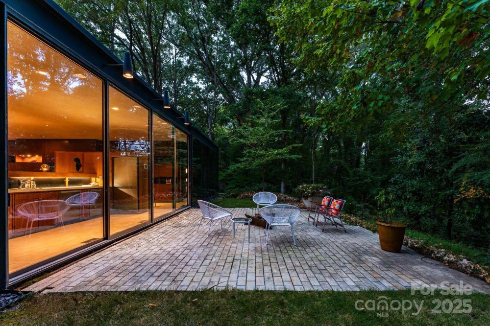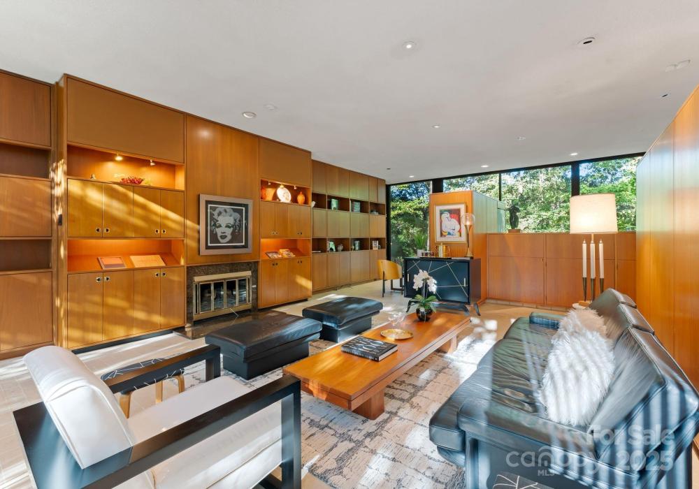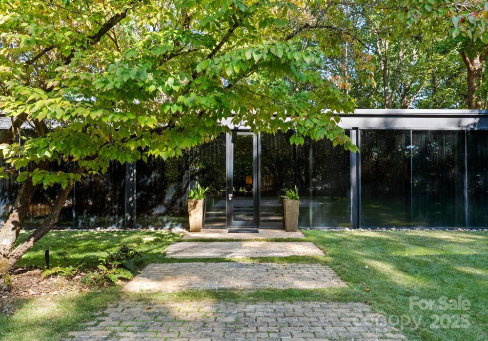 The Bates Glass House, circa 1960, was designed by prominent Charlotte architect Charles Bates as his family home, drawing inspiration from Philip Johnson's iconic New Canaan, Connecticut Glass House built a decade prior. The avant-garde nature of steel and glass pavilion homes from the mid-century era contribute to their rarity both locally and nationally. As much a work of art as it is a residence, The Bates Glass House is one of few Charlotte residences which can claim elite Trophy Property status. Nestled on a serene wooded lot overlooking a pond in what was once rural Charlotte, the residence today is centrally located in our expanding city, yet still retains its original sense of seclusion. The interior teak wall panels and built-ins combined with terrazzo brick flooring create a warm and balanced aesthetic juxtaposed to the glass and steel facade. Seamless integration with the natural surroundings extends a soothing connection to the natural world. The Bates Glass House is truly exceptional in every way. Stay tuned for additional photos to be released throughout the week leading up to Active status on Friday October 17th. This home is expertly staged by Charlotte Vintage with over 50 pieces of period authentic vintage furnishings and decor, all of which are for sale.