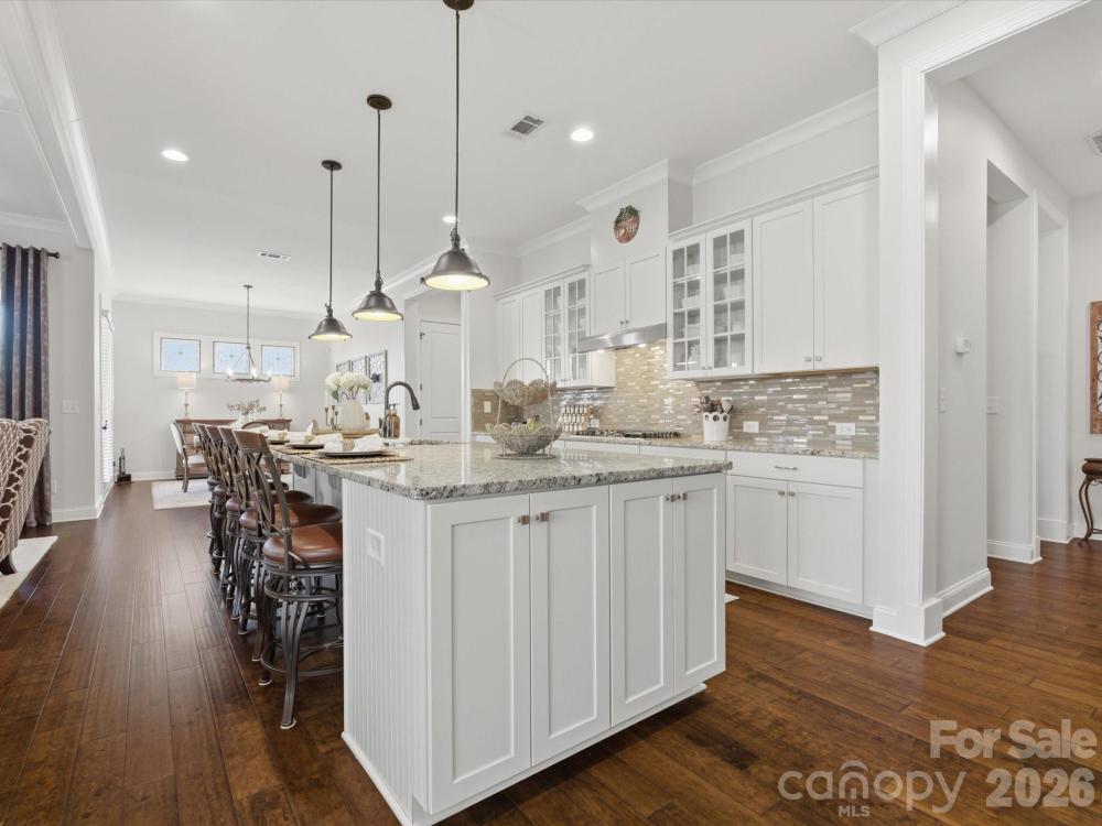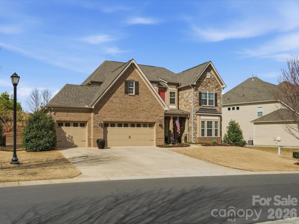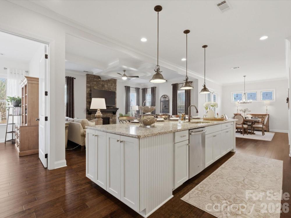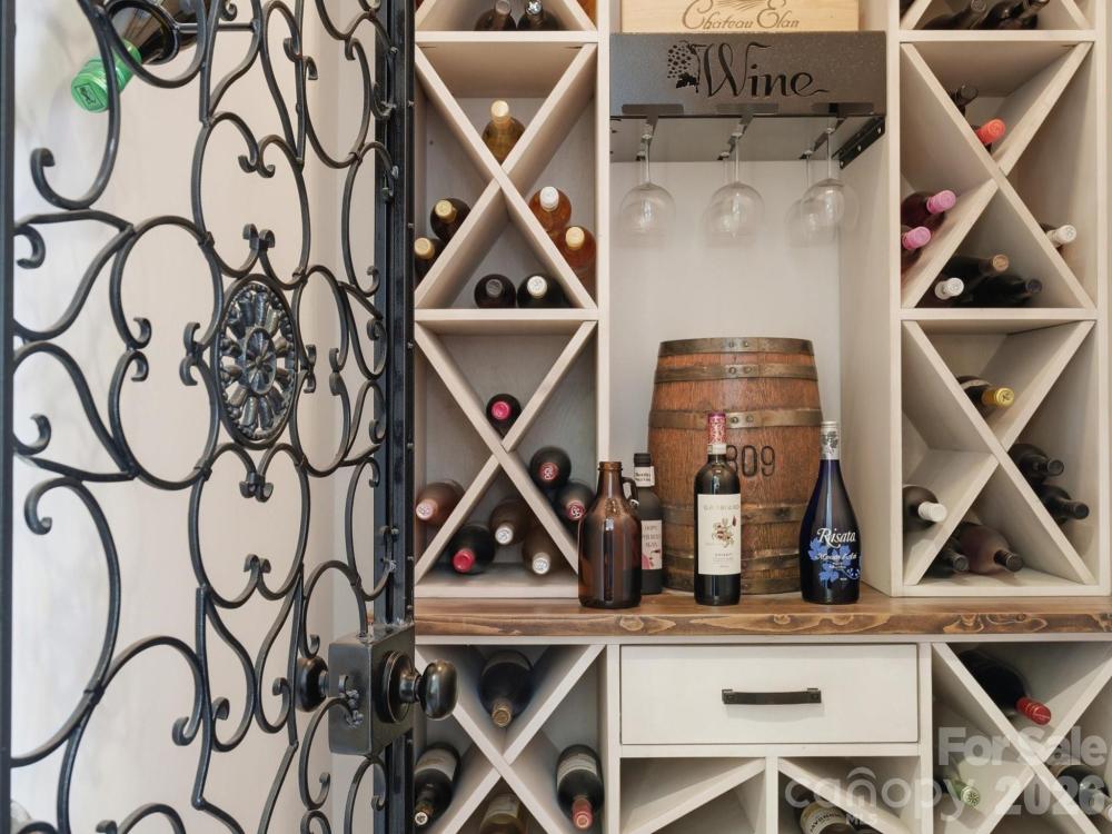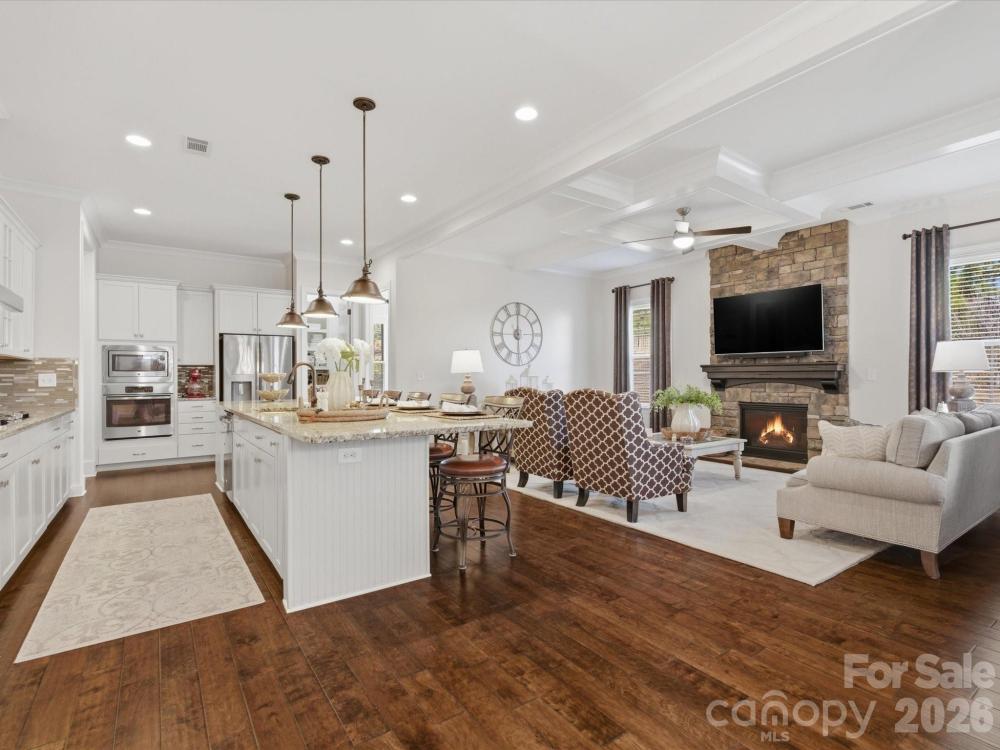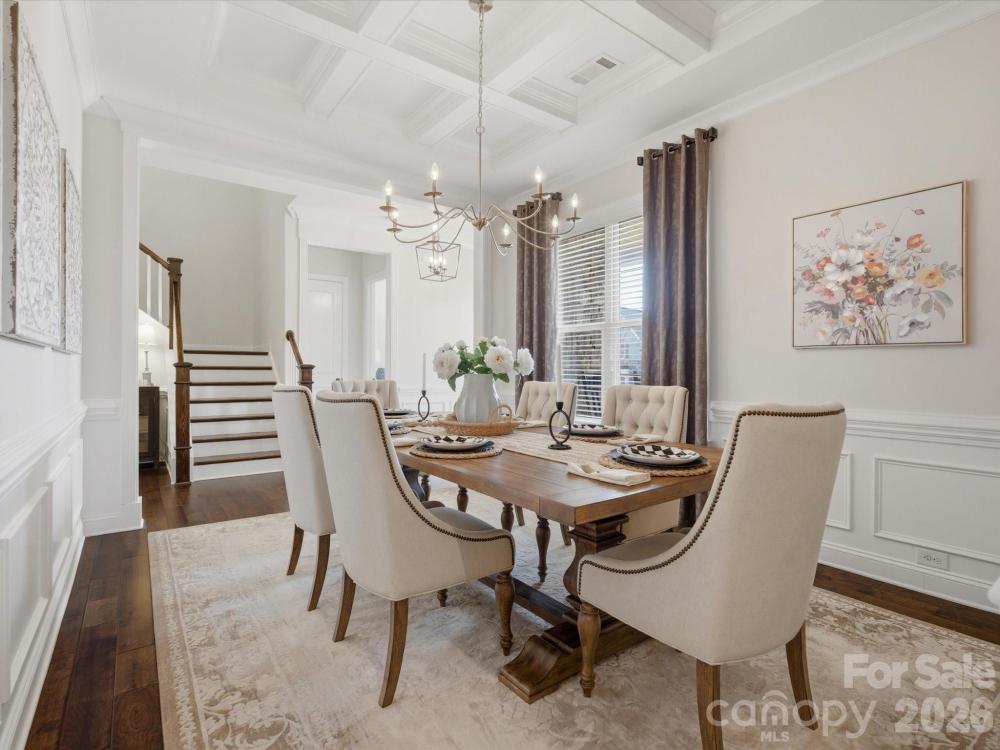 Welcome to this beautifully designed two-story home offering a spacious and functional layout with custom upgrades throughout. The main level features a welcoming foyer, a formal dining room with a coffered ceiling, and a large great room with a coffered ceiling and stone fireplace with a wooden mantel. The kitchen is designed for both everyday living and entertaining, highlighted by a 13-foot island with outlets, crown molding, and a large walk-in pantry with custom shelving. The adjoining breakfast area features custom iron window accents and opens to a bright 3-season sunroom, creating a comfortable space to relax. A flex room with a shiplap accent wall provides the perfect office or additional living space, while a main-floor bedroom adds convenience for guests. The home also features a custom wine room and access to the outdoor patio, ideal for entertaining. Upstairs, the spacious primary suite includes hardwood floors and custom closets. Two additional bedrooms and a large loft provide flexible living space, with the loft featuring custom cabinetry, a refrigerator, and surround sound—perfect for a media or recreation area. The outdoor space is just as inviting, with in-ground sprinklers, outdoor lighting, a large patio with a wood-burning fire pit, and a fenced backyard. Additional storage is available with overhead garage shelving. With thoughtful design, custom architectural details, and great indoor and outdoor living spaces, this home offers comfort, functionality, and style.