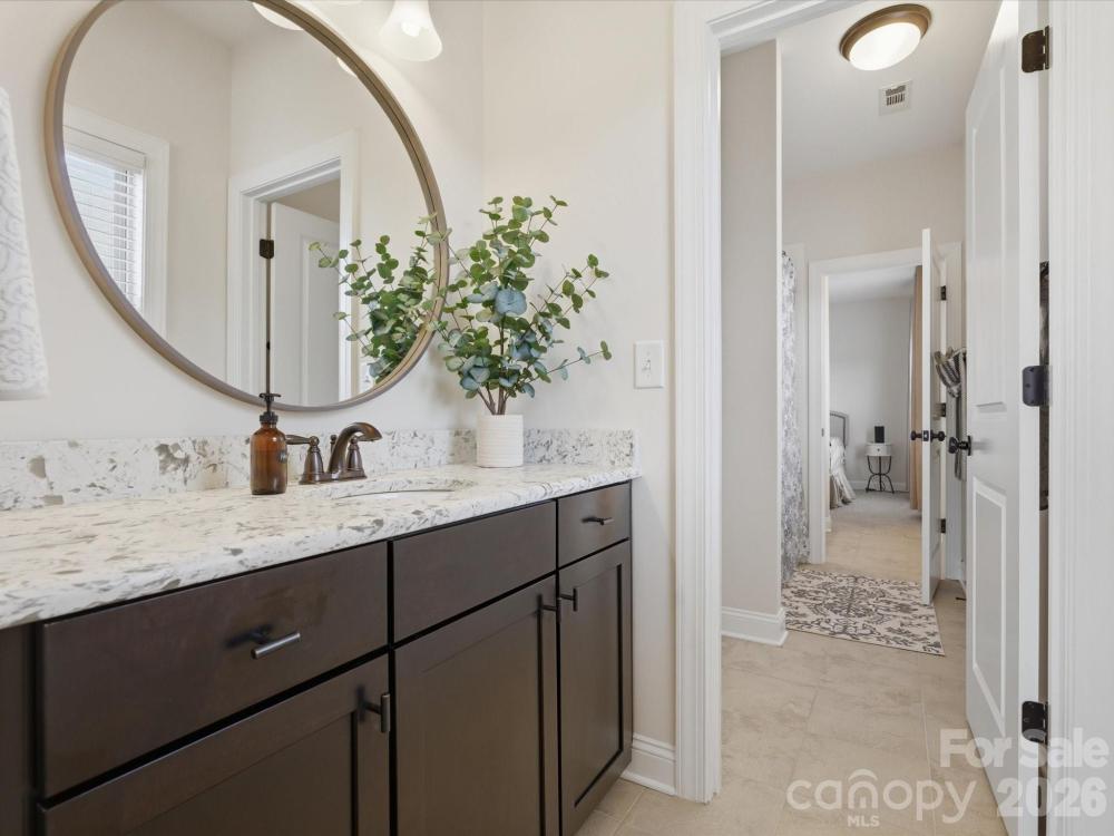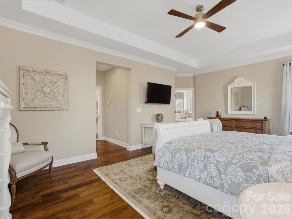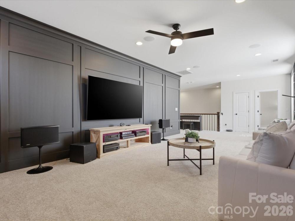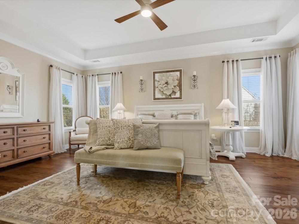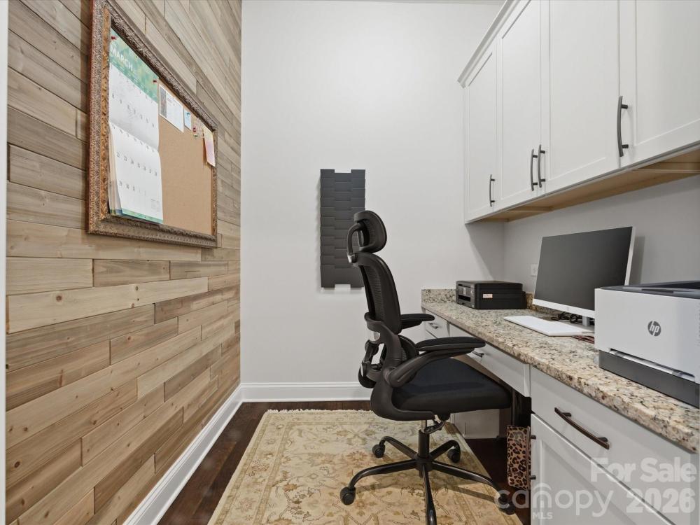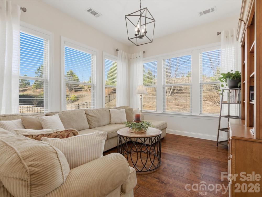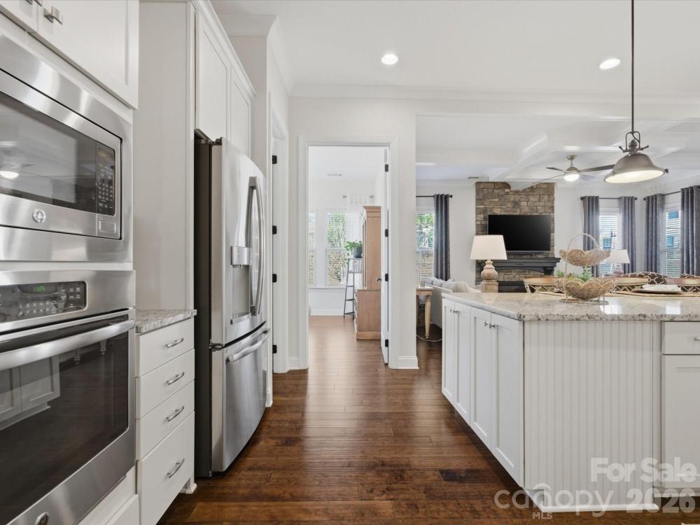 Welcome to this beautifully designed two-story home offering a spacious and functional layout with custom upgrades throughout. The main level features a welcoming foyer, a formal dining room with a coffered ceiling, and a large great room with a coffered ceiling and stone fireplace with a wooden mantel. The kitchen is designed for both everyday living and entertaining, highlighted by a 13-foot island with outlets, crown molding, and a large walk-in pantry with custom shelving. The adjoining breakfast area features custom iron window accents and opens to a bright 3-season sunroom, creating a comfortable space to relax. A flex room with a shiplap accent wall provides the perfect office or additional living space, while a main-floor bedroom adds convenience for guests. The home also features a custom wine room and access to the outdoor patio, ideal for entertaining. Upstairs, the spacious primary suite includes hardwood floors and custom closets. Two additional bedrooms and a large loft provide flexible living space, with the loft featuring custom cabinetry, a refrigerator, and surround sound—perfect for a media or recreation area. The outdoor space is just as inviting, with in-ground sprinklers, outdoor lighting, a large patio with a wood-burning fire pit, and a fenced backyard. Additional storage is available with overhead garage shelving. With thoughtful design, custom architectural details, and great indoor and outdoor living spaces, this home offers comfort, functionality, and style.