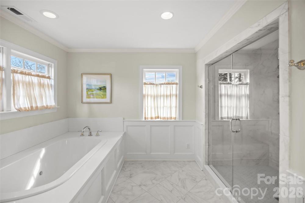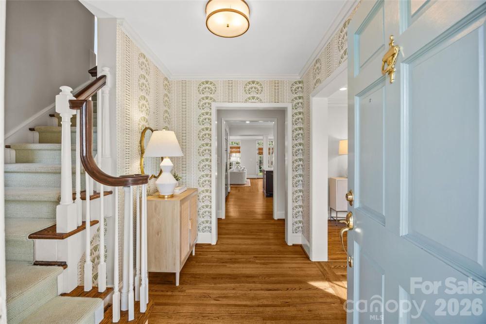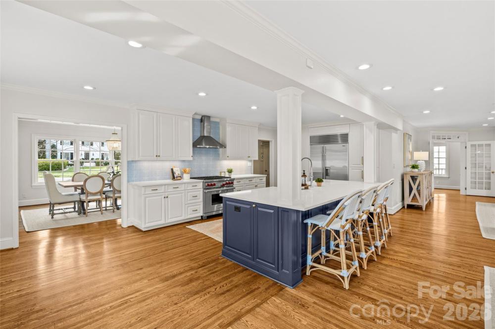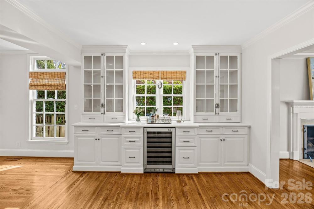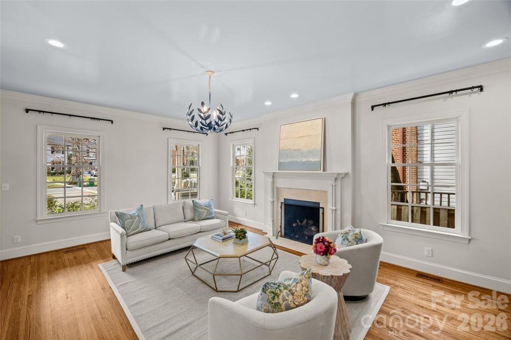 Situated on Hampton Avenue in the heart of Myers Park, this beautifully updated 4-bedroom, 3.5-bath traditional home is completely move-in ready and thoughtfully designed. The desirable open floor plan features hardwood floors, ornate custom moldings, and tasteful finishes throughout. Formal living and dining rooms each with gas fireplaces provide the perfect space for entertaining, while the expansive kitchen serves as the centerpiece of the home with white custom cabinetry, quartz countertops, center island, and high-end stainless appliances including a Wolf gas range and Sub-Zero refrigerator. The kitchen flows seamlessly into the sprawling dining area and family room, offering exceptional flexibility for everyday living. Additional highlights include a private office with built-ins and spacious laundry room/drop zone with abundant storage. Upstairs offers a serene primary suite with fireplace, walk-in closet, and spa-inspired bath plus three secondary bedrooms and bonus room. Outdoors, enjoy a fully fenced, turfed backyard with mature landscaping, spacious brick patio, outdoor fireplace, and built-in grilling station. Ideally located near Uptown and SouthPark, this home blends classic charm with modern comfort.