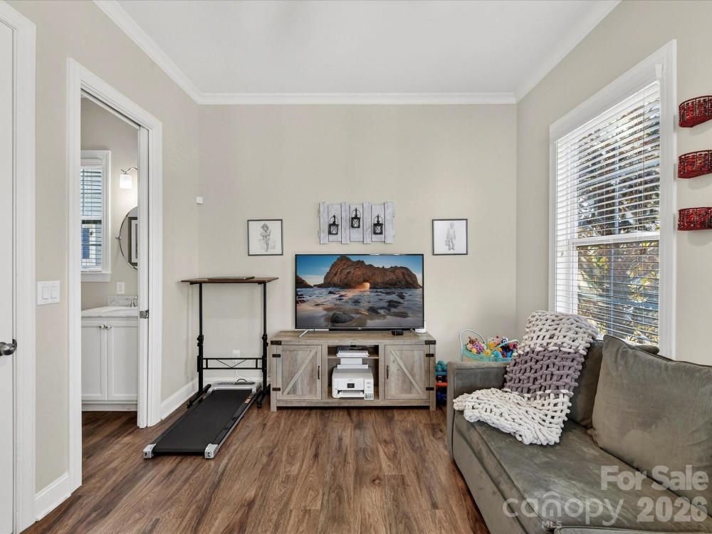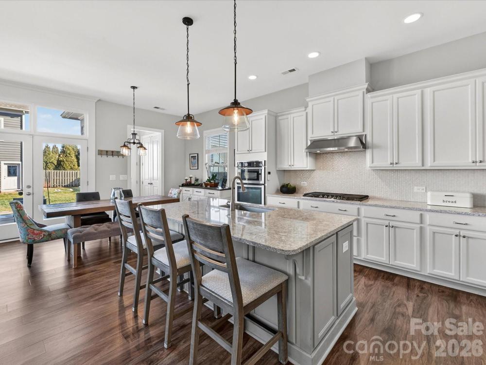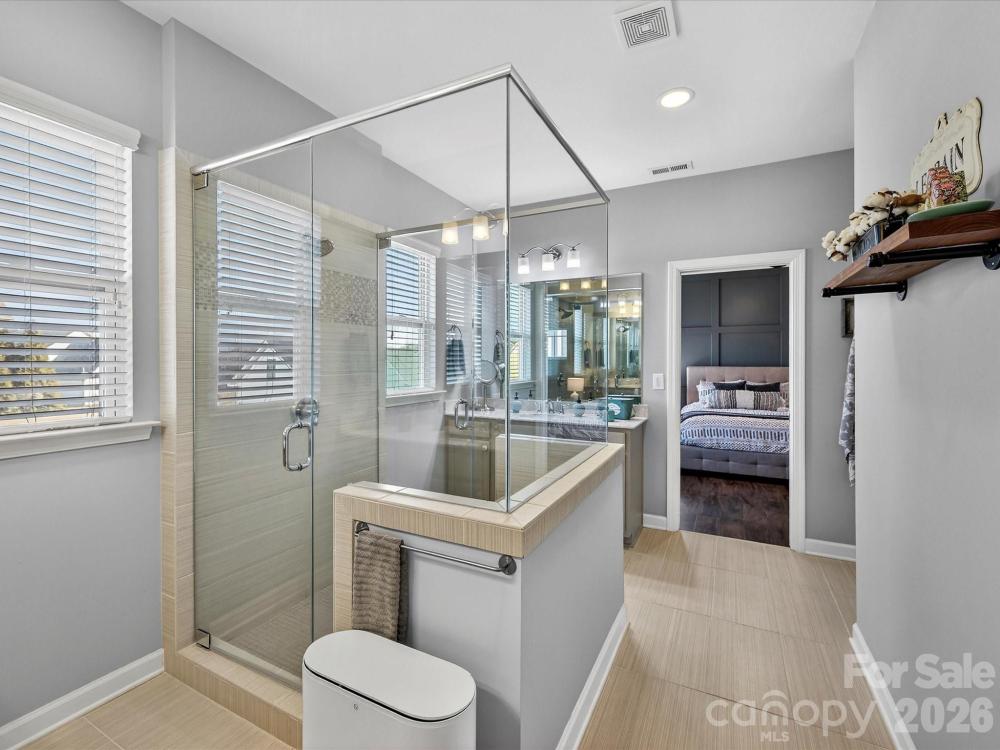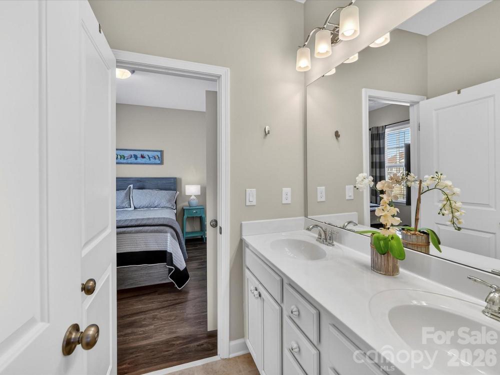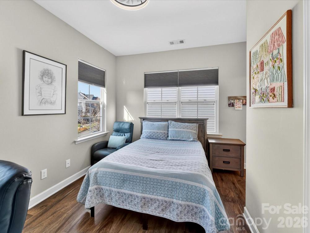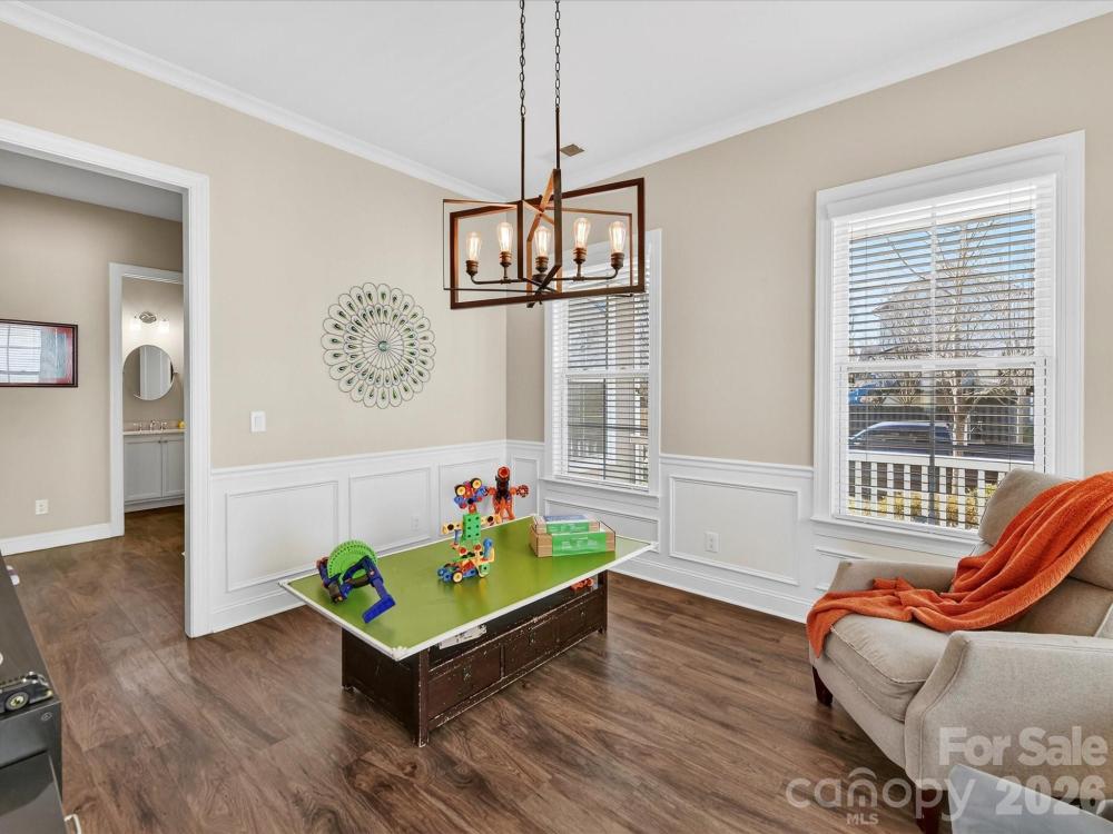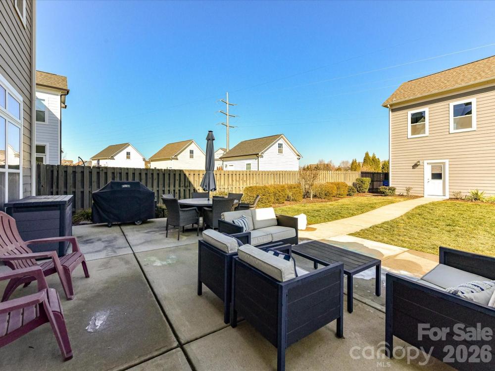 This charming 3-level Charleston-style home welcomes you with character at every turn. The inviting wraparound porch leads into a flexible floor plan featuring 6 bedrooms and 5 full bathrooms. Main level highlights include soaring 10’ ceilings and transom windows that evoke historic architectural elements. The open layout provides a spacious great room, complete with built-in bookcases flanking a gas fireplace. Low maintenance and durable LVP flooring throughout all living areas. At the center of the kitchen is a large island that serves double duty as a breakfast bar and prep area, adorned with quartz countertops and pendant lighting. Stainless steel appliances—gas cooktop, wall oven/microwave, and dishwasher—will please any chef. A butler’s pantry conveniently connects the kitchen to the formal dining room, which is currently set up as a playroom. On the main floor, a guest room adjoins a full bath with a step-in shower, making it ideal for guests, in-laws, or as a private office. At the back door, a drop station opens to a generous, flat fenced yard—perfect for pets and play—with lush landscaping that blooms throughout the warmer months and a spacious patio designed for outdoor entertaining. The detached oversized 2-car garage (21’ x 25’) is an exceptional bonus, offering a full walk-up attic with approximately 462 sq ft for storage or potential future finished space. The primary bedroom suite features a geometric accent wall, and a luxurious bathroom with a see-through shower and two walk-in closets. The third floor offers a second bedroom ensuite or versatile bonus room. Residents enjoy outstanding community amenities including tennis and pickleball courts, two resort-style pools, a clubhouse, playgrounds, and a dog park. The location is convenient to historic downtown Pineville, Ballantyne, and I-485. Make this home your very own!