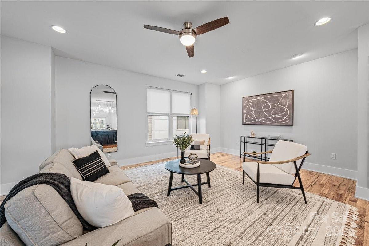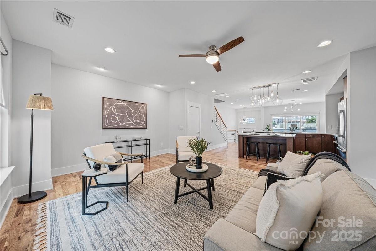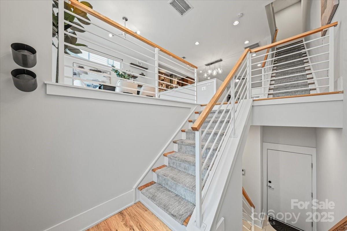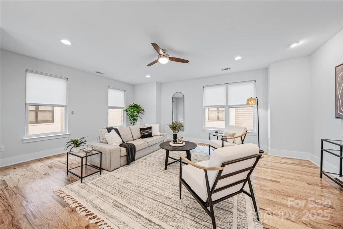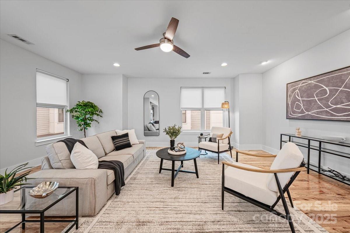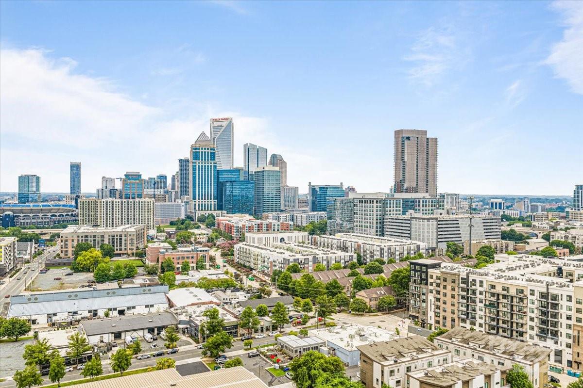 Rare end-unit in South End’s coveted Lumina community, steps from dining, shops, breweries, and light rail. This 3-bed, 3-bath, 3-story townhome with 2-car rear-load garage blends luxury finishes with smart, energy-efficient upgrades. Bright open floor plan features site-finished hardwoods, gourmet kitchen with Bosch appliances, wine fridge, quartz counters, and upgraded cabinetry. Extra windows—exclusive to end-units—fill the home with natural light. Each bedroom offers its own en-suite; the primary boasts a walk-in closet, Juliet balcony, and unobstructed Uptown skyline views. Recent upgrades include new HVAC (2025) with 3 smart thermostats, built-in air purification (2023), and CPI security. Enjoy a fenced courtyard, private balcony, and low-maintenance living with HOA covering exterior, landscaping, water, sewer & trash.
