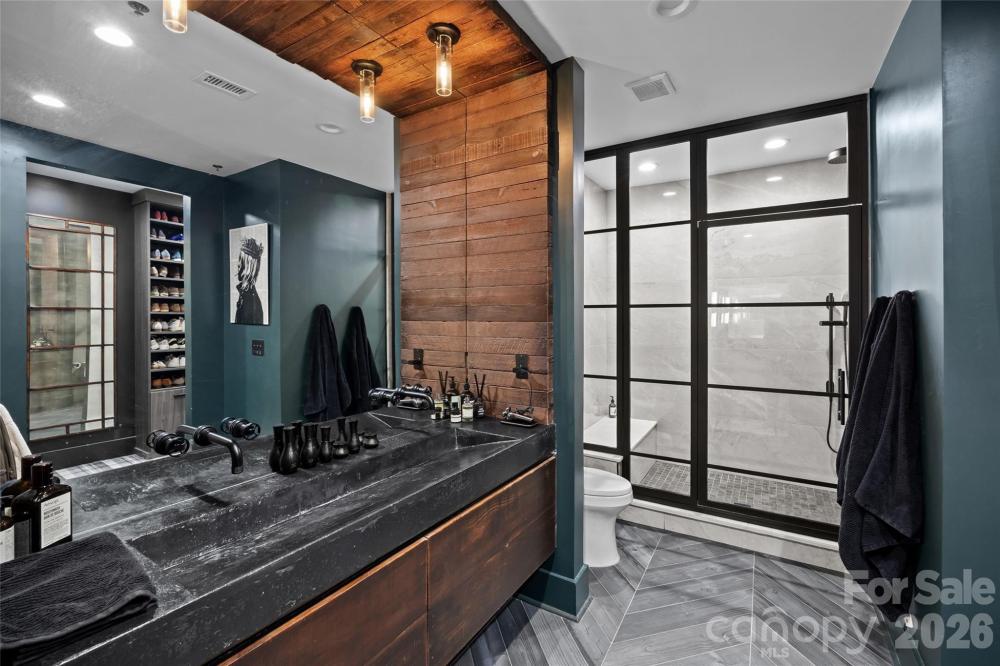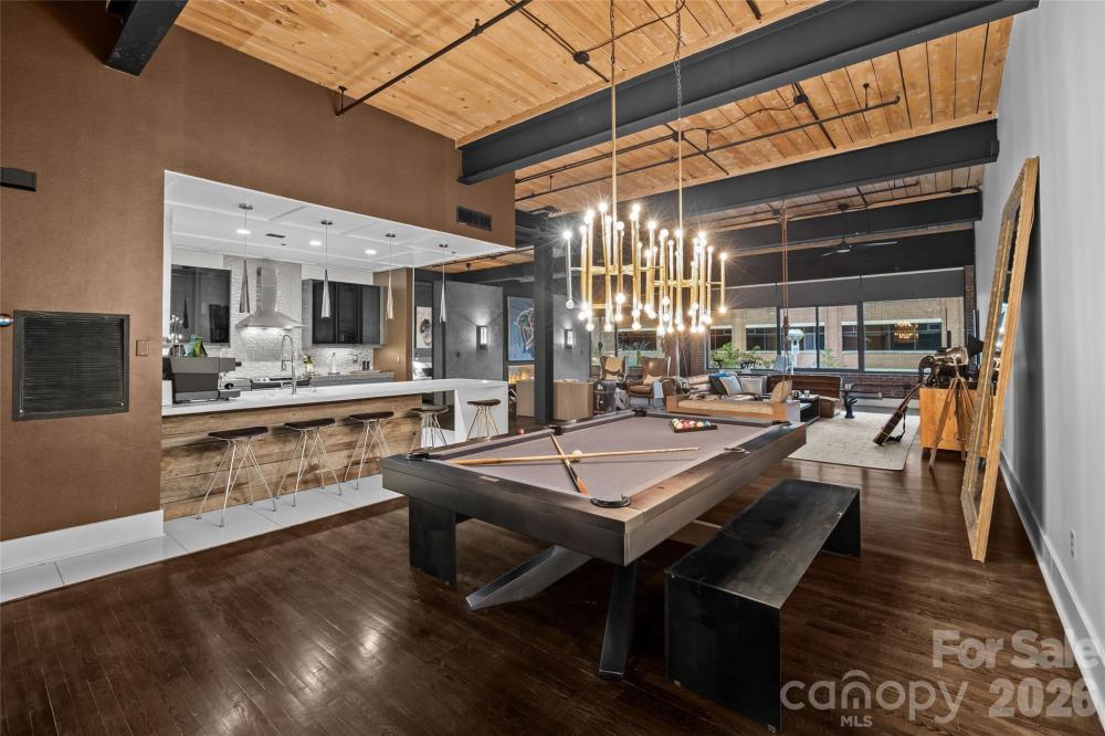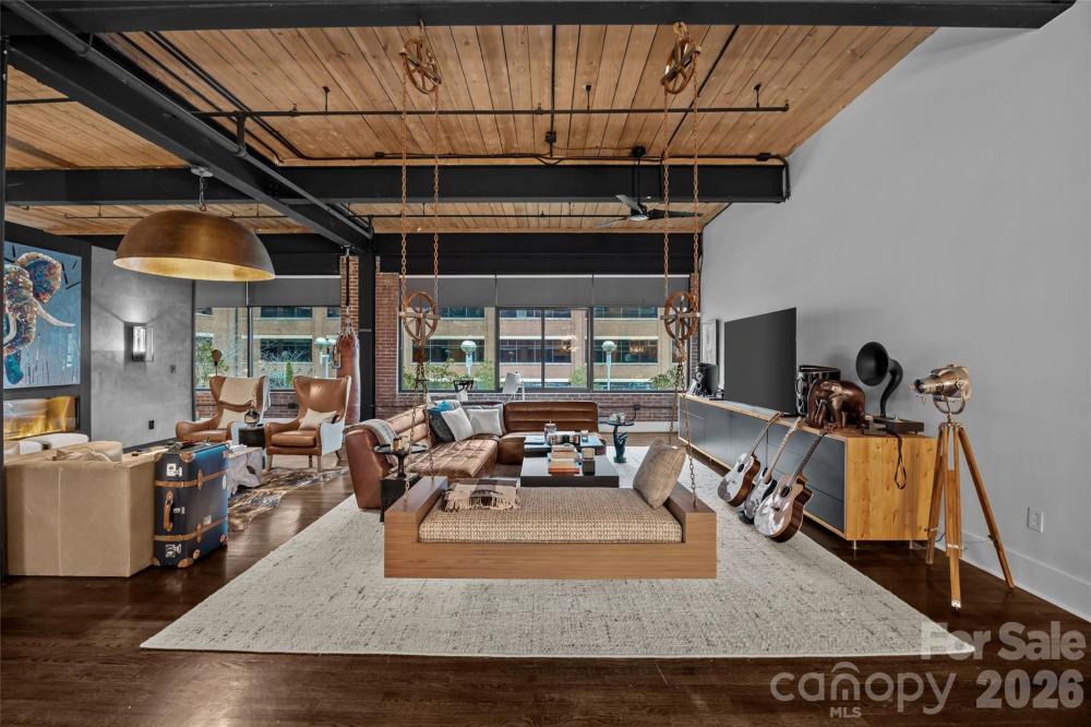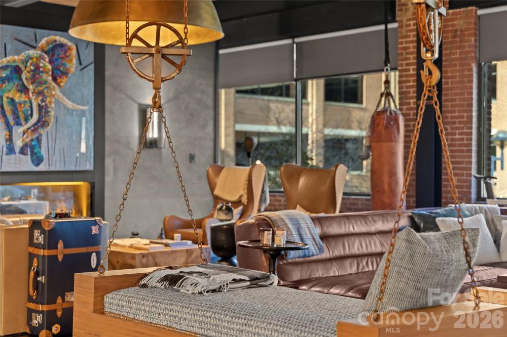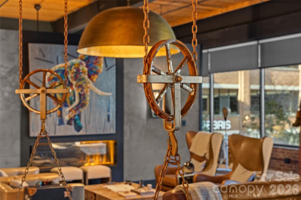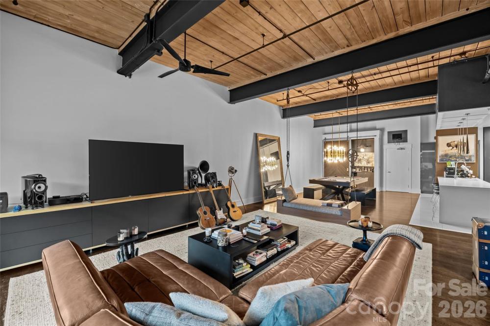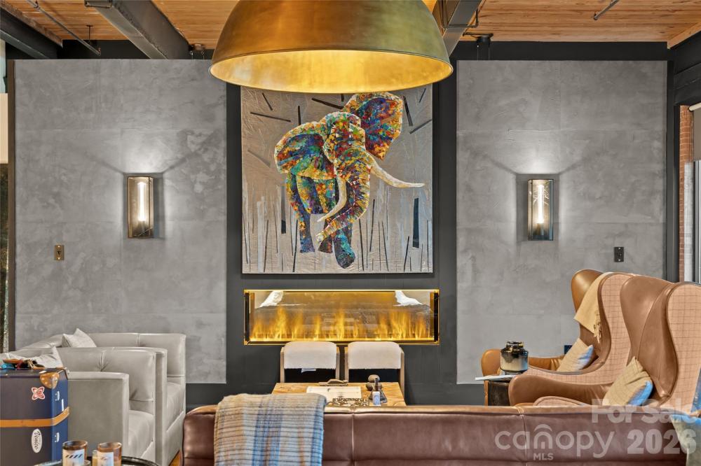 One-of-a-kind industrial loft located at The Lofts at Factory South in Charlotte’s vibrant South End, set within the iconic historic Lance Factory. This authentic adaptive-reuse conversion blends preserved architectural character with curated modern luxury, offering a rare opportunity to own a true urban showpiece. One of the very few buildings in the city offering true live/work flexibility, the property is ideally suited for entrepreneurs, creatives, consultants, or executives seeking an integrated residential and professional environment. Monthly rentals are permitted, creating additional versatility for corporate housing, executive relocation stays, or furnished mid-term leasing. Encompassing over 2,000 square feet, the residence is defined by soaring ceilings, exposed structural elements, warm wood planking, polished concrete accents, and expansive factory-style windows that flood the interior with natural light. Designer lighting, custom wall treatments, and bespoke finishes elevate the living experience throughout. The open-concept living space is anchored by a dramatic two-sided linear fireplace — a striking architectural focal point shared between the main living area and the private primary suite. Framed in custom paneling and textural finishes, the fireplace creates warmth, ambiance, and visual continuity between entertaining and retreat spaces. The chef’s kitchen pairs industrial edge with refined function, featuring sleek contemporary cabinetry, professional-grade stainless appliances, statement vent hood, full-height tile backsplash, and an expansive waterfall island wrapped in reclaimed wood with bar seating. Custom concrete countertops add durability and architectural authenticity. Designed for entertaining and lifestyle flexibility, the residence offers a dedicated recreation lounge with billiards, designer chandelier lighting, and a fully appointed private bar with custom cabinetry. Additional fitness and training space further enhances the live-work-play environment. The primary suite serves as a private sanctuary layered in rich textures and custom detailing, enhanced by the glow of the two-sided fireplace. The spa-inspired primary bath features an oversized walk-in shower clad in dramatic stone with rain head, handheld wand, and integrated body sprays. Custom concrete countertops continue the industrial design narrative. A boutique-style dressing room completes the retreat with extensive custom wardrobe storage, integrated laundry, curated shoe displays, and a built-in clothing steamer. A separate guest powder room provides added convenience. The unit includes a covered, gated parking space and private storage unit — rare and valuable conveniences for loft living. Positioned in the heart of South End, the building offers a light rail stop at your back door with effortless access to Uptown, Dilworth, and Wilmore, along with nearby dining, nightlife, rail trail access, and daily amenities. A truly unique and hard-to-find industrial loft offering within one of Charlotte’s most dynamic urban districts.