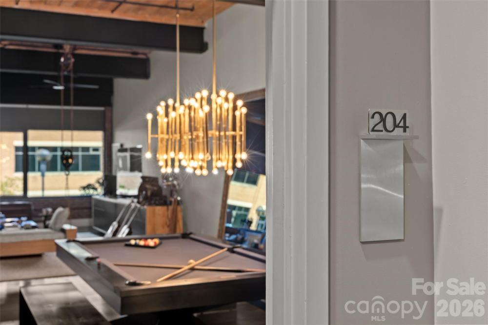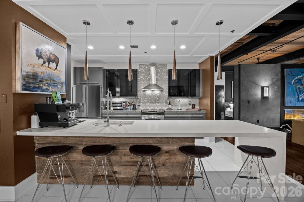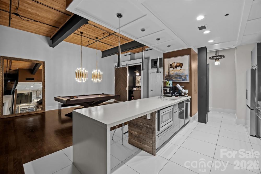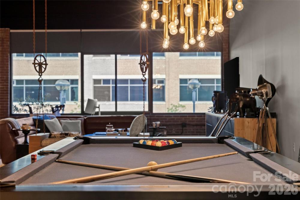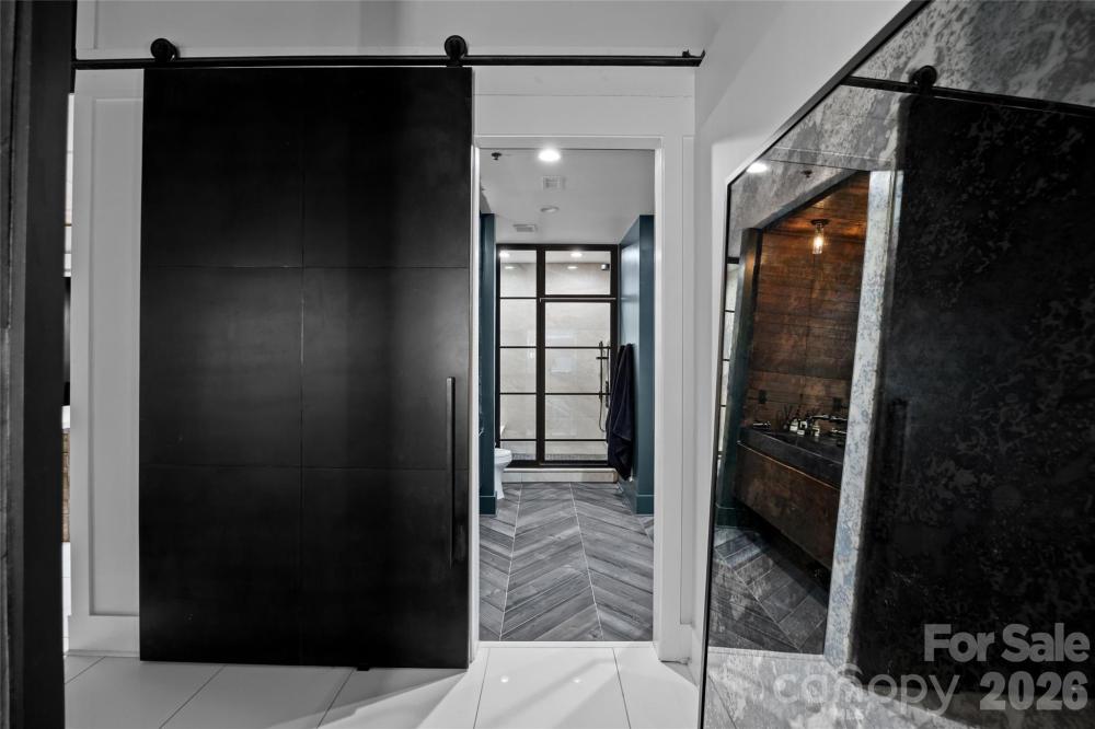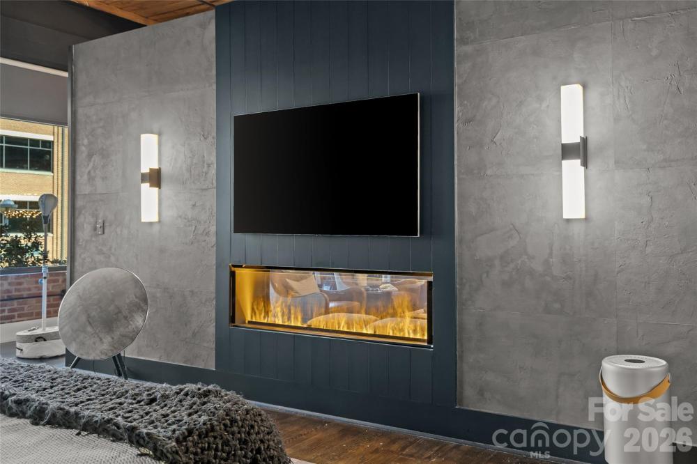 One-of-a-kind industrial loft located at The Lofts at Factory South in Charlotte’s vibrant South End, set within the iconic historic Lance Factory. This authentic adaptive-reuse conversion blends preserved architectural character with curated modern luxury, offering a rare opportunity to own a true urban showpiece. One of the very few buildings in the city offering true live/work flexibility, the property is ideally suited for entrepreneurs, creatives, consultants, or executives seeking an integrated residential and professional environment. Monthly rentals are permitted, creating additional versatility for corporate housing, executive relocation stays, or furnished mid-term leasing. Encompassing over 2,000 square feet, the residence is defined by soaring ceilings, exposed structural elements, warm wood planking, polished concrete accents, and expansive factory-style windows that flood the interior with natural light. Designer lighting, custom wall treatments, and bespoke finishes elevate the living experience throughout. The open-concept living space is anchored by a dramatic two-sided linear fireplace — a striking architectural focal point shared between the main living area and the private primary suite. Framed in custom paneling and textural finishes, the fireplace creates warmth, ambiance, and visual continuity between entertaining and retreat spaces. The chef’s kitchen pairs industrial edge with refined function, featuring sleek contemporary cabinetry, professional-grade stainless appliances, statement vent hood, full-height tile backsplash, and an expansive waterfall island wrapped in reclaimed wood with bar seating. Custom concrete countertops add durability and architectural authenticity. Designed for entertaining and lifestyle flexibility, the residence offers a dedicated recreation lounge with billiards, designer chandelier lighting, and a fully appointed private bar with custom cabinetry. Additional fitness and training space further enhances the live-work-play environment. The primary suite serves as a private sanctuary layered in rich textures and custom detailing, enhanced by the glow of the two-sided fireplace. The spa-inspired primary bath features an oversized walk-in shower clad in dramatic stone with rain head, handheld wand, and integrated body sprays. Custom concrete countertops continue the industrial design narrative. A boutique-style dressing room completes the retreat with extensive custom wardrobe storage, integrated laundry, curated shoe displays, and a built-in clothing steamer. A separate guest powder room provides added convenience. The unit includes a covered, gated parking space and private storage unit — rare and valuable conveniences for loft living. Positioned in the heart of South End, the building offers a light rail stop at your back door with effortless access to Uptown, Dilworth, and Wilmore, along with nearby dining, nightlife, rail trail access, and daily amenities. A truly unique and hard-to-find industrial loft offering within one of Charlotte’s most dynamic urban districts.