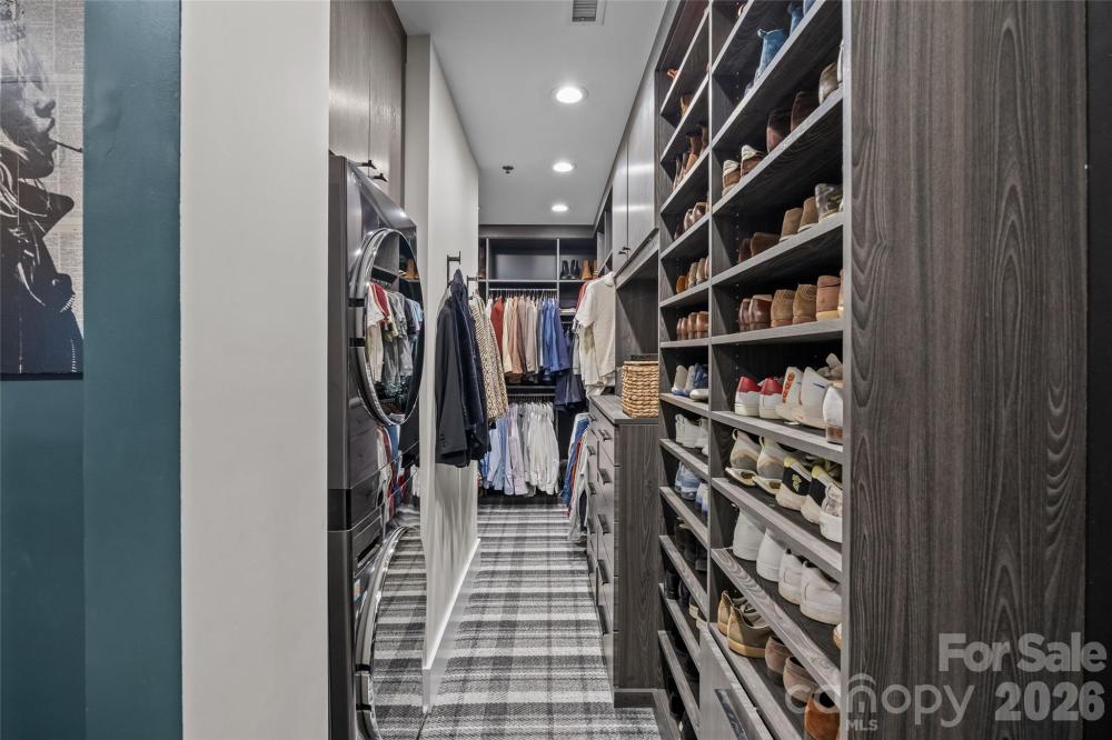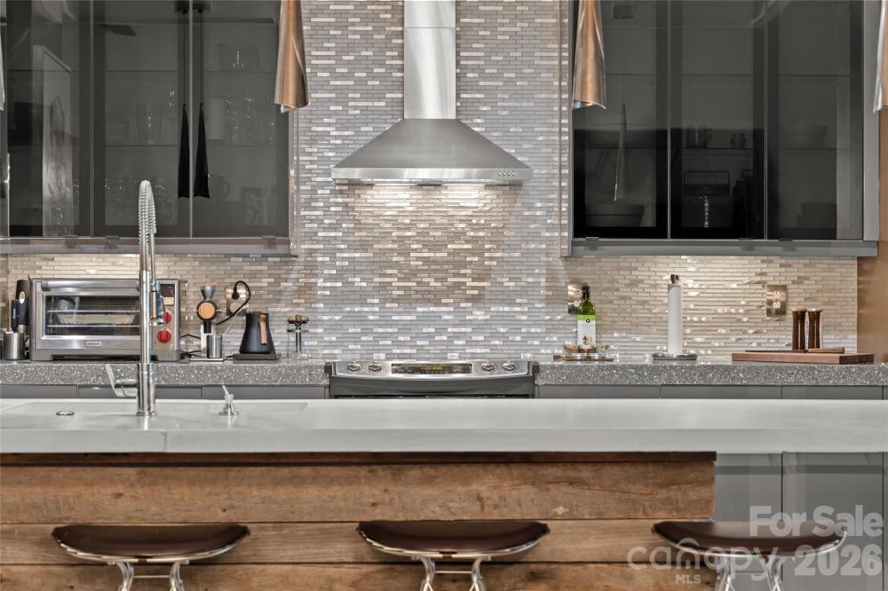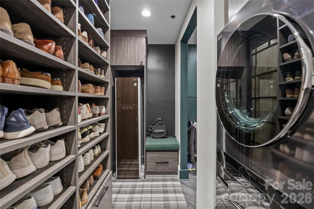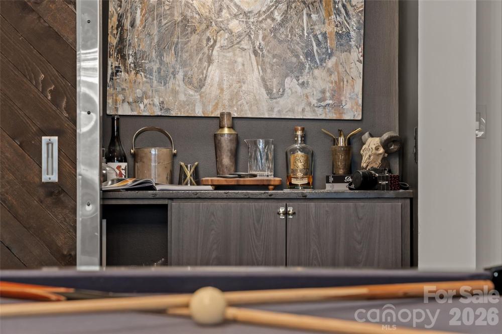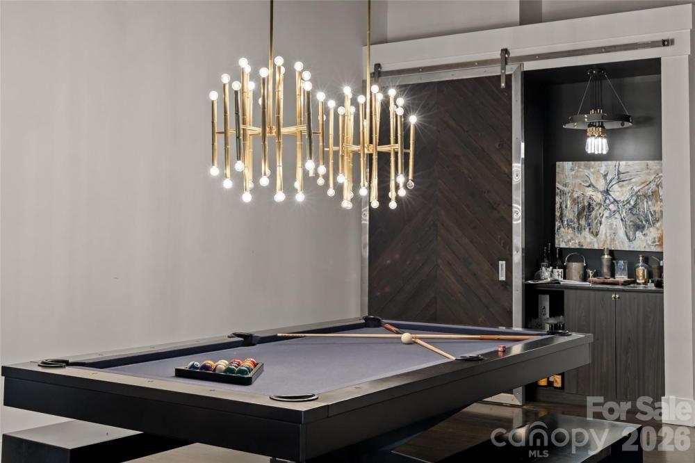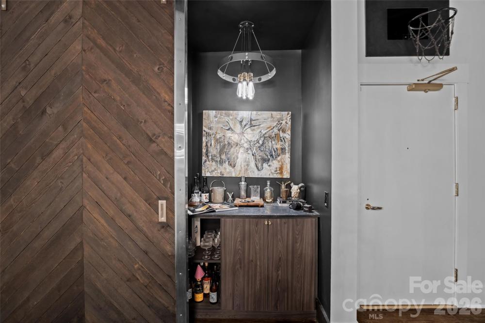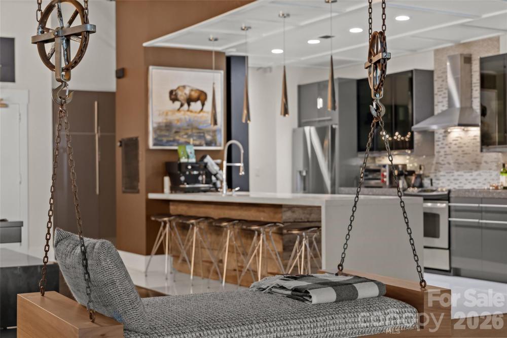 One-of-a-kind industrial loft located at The Lofts at Factory South in Charlotte’s vibrant South End, set within the iconic historic Lance Factory. This authentic adaptive-reuse conversion blends preserved architectural character with curated modern luxury, offering a rare opportunity to own a true urban showpiece. One of the very few buildings in the city offering true live/work flexibility, the property is ideally suited for entrepreneurs, creatives, consultants, or executives seeking an integrated residential and professional environment. Monthly rentals are permitted, creating additional versatility for corporate housing, executive relocation stays, or furnished mid-term leasing. Encompassing over 2,000 square feet, the residence is defined by soaring ceilings, exposed structural elements, warm wood planking, polished concrete accents, and expansive factory-style windows that flood the interior with natural light. Designer lighting, custom wall treatments, and bespoke finishes elevate the living experience throughout. The open-concept living space is anchored by a dramatic two-sided linear fireplace — a striking architectural focal point shared between the main living area and the private primary suite. Framed in custom paneling and textural finishes, the fireplace creates warmth, ambiance, and visual continuity between entertaining and retreat spaces. The chef’s kitchen pairs industrial edge with refined function, featuring sleek contemporary cabinetry, professional-grade stainless appliances, statement vent hood, full-height tile backsplash, and an expansive waterfall island wrapped in reclaimed wood with bar seating. Custom concrete countertops add durability and architectural authenticity. Designed for entertaining and lifestyle flexibility, the residence offers a dedicated recreation lounge with billiards, designer chandelier lighting, and a fully appointed private bar with custom cabinetry. Additional fitness and training space further enhances the live-work-play environment. The primary suite serves as a private sanctuary layered in rich textures and custom detailing, enhanced by the glow of the two-sided fireplace. The spa-inspired primary bath features an oversized walk-in shower clad in dramatic stone with rain head, handheld wand, and integrated body sprays. Custom concrete countertops continue the industrial design narrative. A boutique-style dressing room completes the retreat with extensive custom wardrobe storage, integrated laundry, curated shoe displays, and a built-in clothing steamer. A separate guest powder room provides added convenience. The unit includes a covered, gated parking space and private storage unit — rare and valuable conveniences for loft living. Positioned in the heart of South End, the building offers a light rail stop at your back door with effortless access to Uptown, Dilworth, and Wilmore, along with nearby dining, nightlife, rail trail access, and daily amenities. A truly unique and hard-to-find industrial loft offering within one of Charlotte’s most dynamic urban districts.